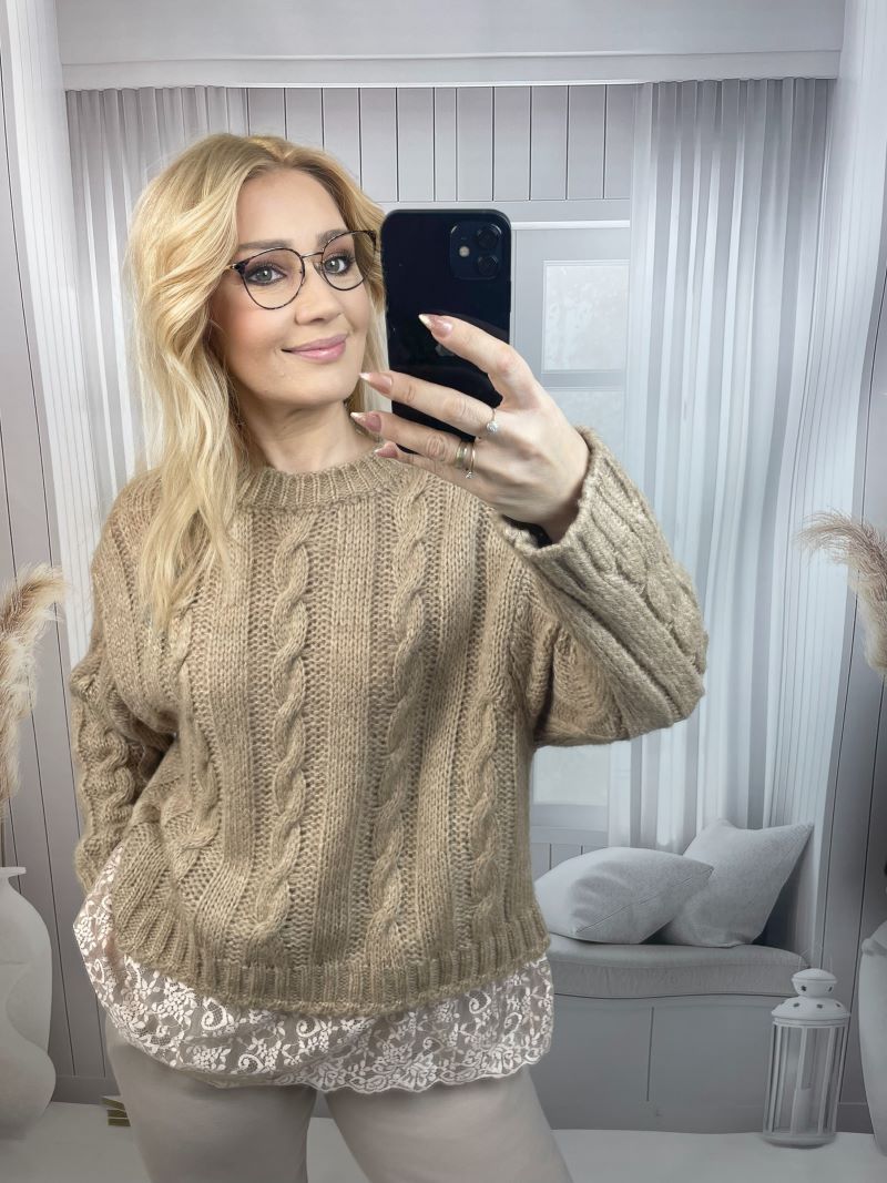 Model wyróżnia się wrabianą strukturą z przodu i z tyłu, która dodaje głębi, pięknie układa się na sylwetce i nadaje całości nowoczesnego charakteru. Klasyczny, okrągły dekolt sprawia, że sweter jest niezwykle uniwersalny i pasuje do każdej stylizacji. Całość dopełnia efektowna koronkowa falbana na dole, która dodaje lekkości, romantycznego uroku i sprawia, że sweter wygląda wyjątkowo kobieco.