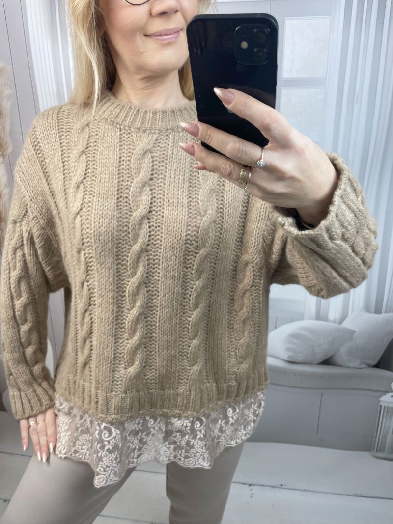 Sweter Wrabiany z Koronkową Falbaną Ciemny Beż
