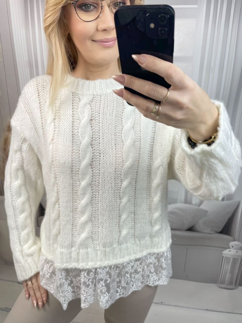 Model wyróżnia się wrabianą strukturą z przodu i z tyłu, która dodaje głębi, pięknie układa się na sylwetce i nadaje całości nowoczesnego charakteru. Klasyczny, okrągły dekolt sprawia, że sweter jest niezwykle uniwersalny i pasuje do każdej stylizacji. Całość dopełnia efektowna koronkowa falbana na dole, która dodaje lekkości, romantycznego uroku i sprawia, że sweter wygląda wyjątkowo kobieco.