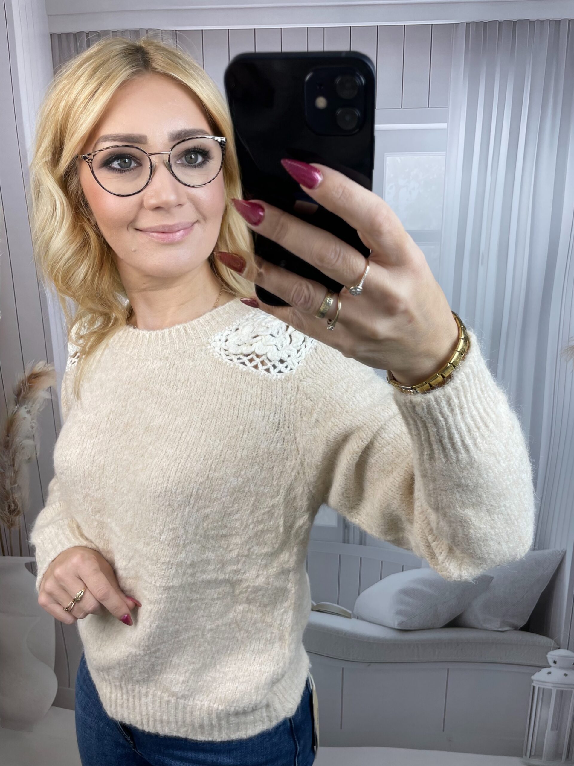 Stylowy sweter z ażurową, kontrastującą wstawką na ramieniu to wyjątkowy model, który łączy klasykę z nowoczesnym akcentem. Wykonany z miękkiej, przyjemnej w dotyku dzianiny, zapewnia komfort i wygodę noszenia, a ażurowy detal dodaje mu lekkości oraz kobiecego uroku. Subtelny kontrast kolorów sprawia, że sweter wyróżnia się na tle codziennych stylizacji, zachowując elegancki charakter.
