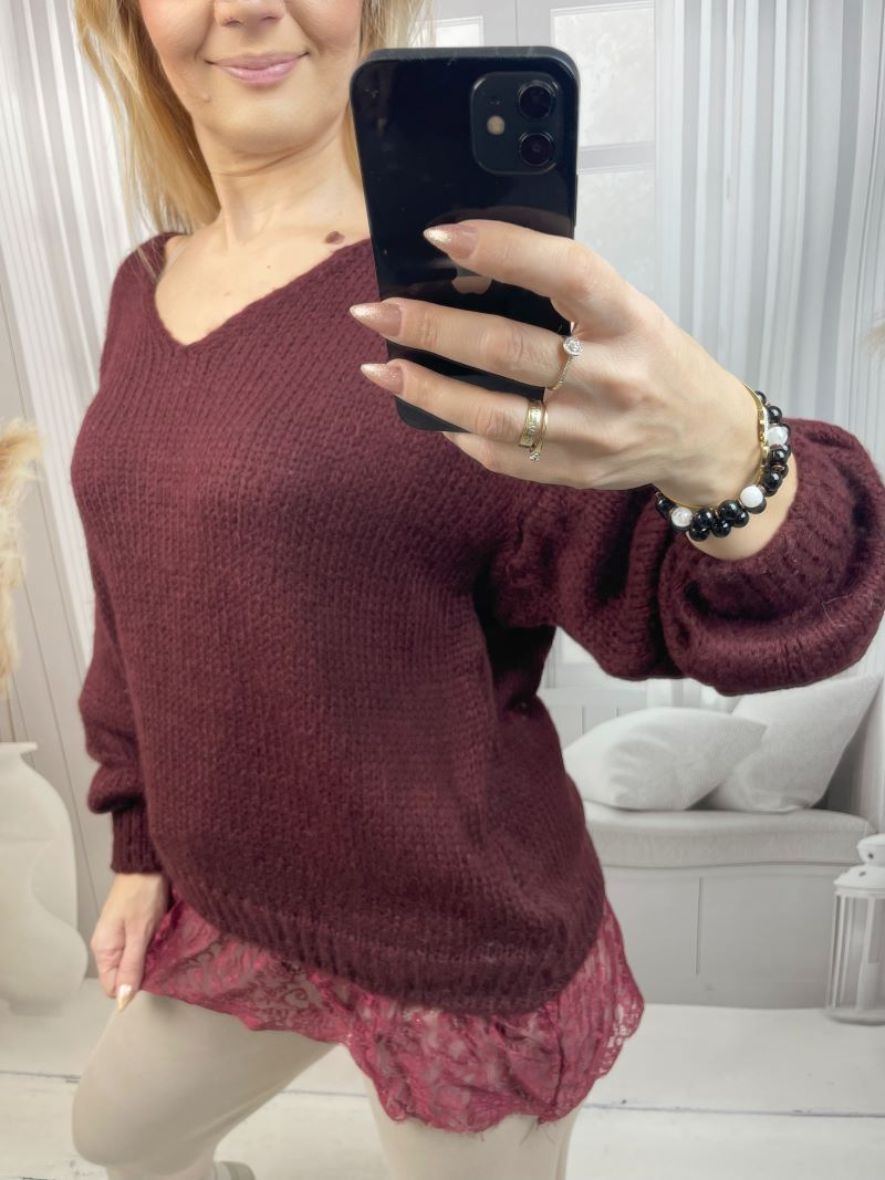 Sweter z Koronkową Falbaną z Dekoltem V Bordo