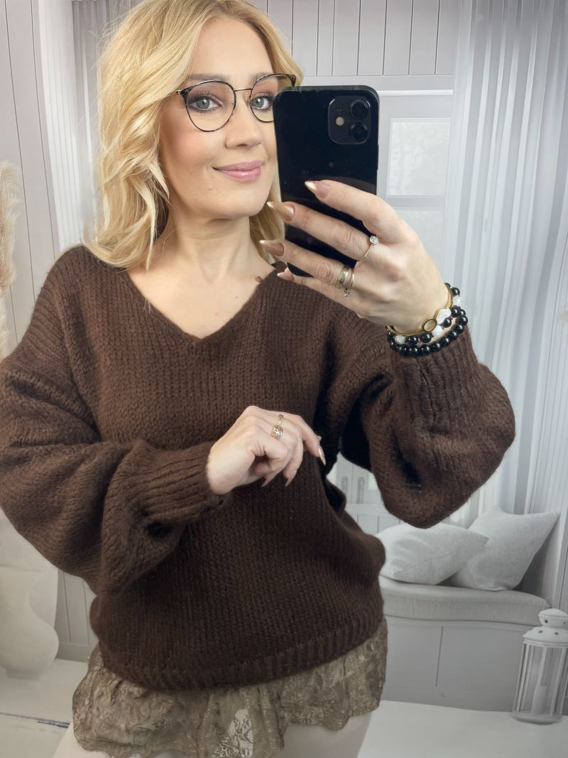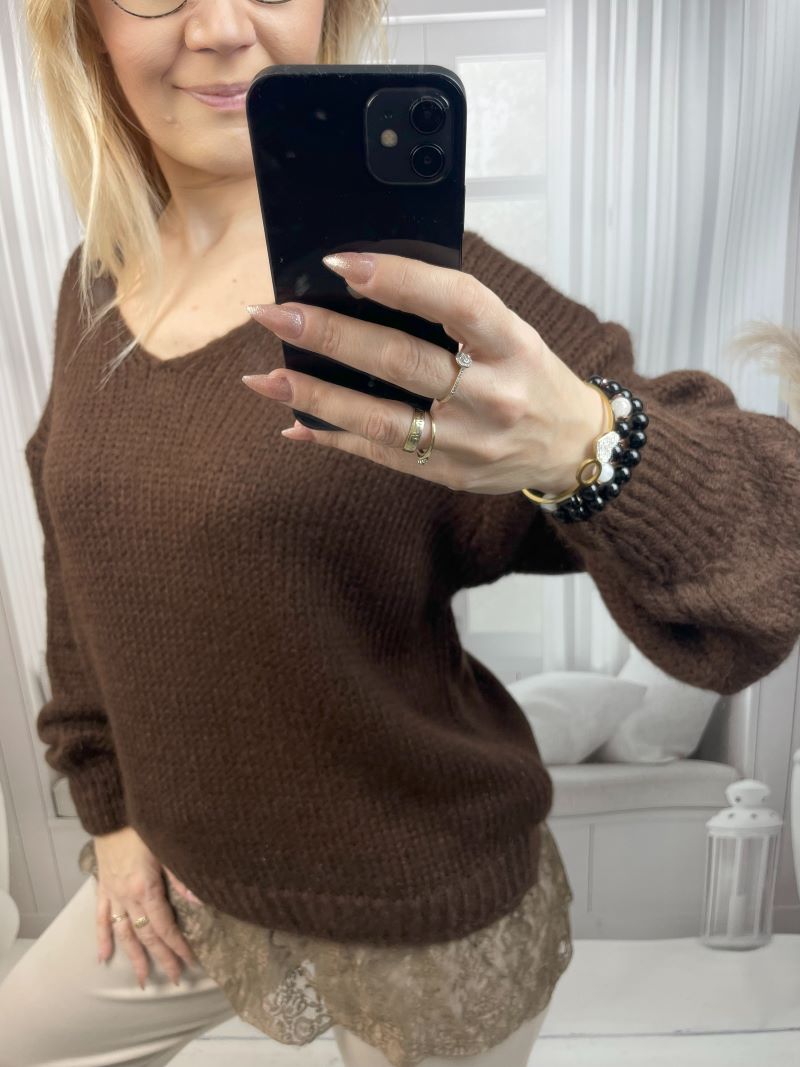 Sweter z Koronkową Falbaną z Dekoltem V Czekolada