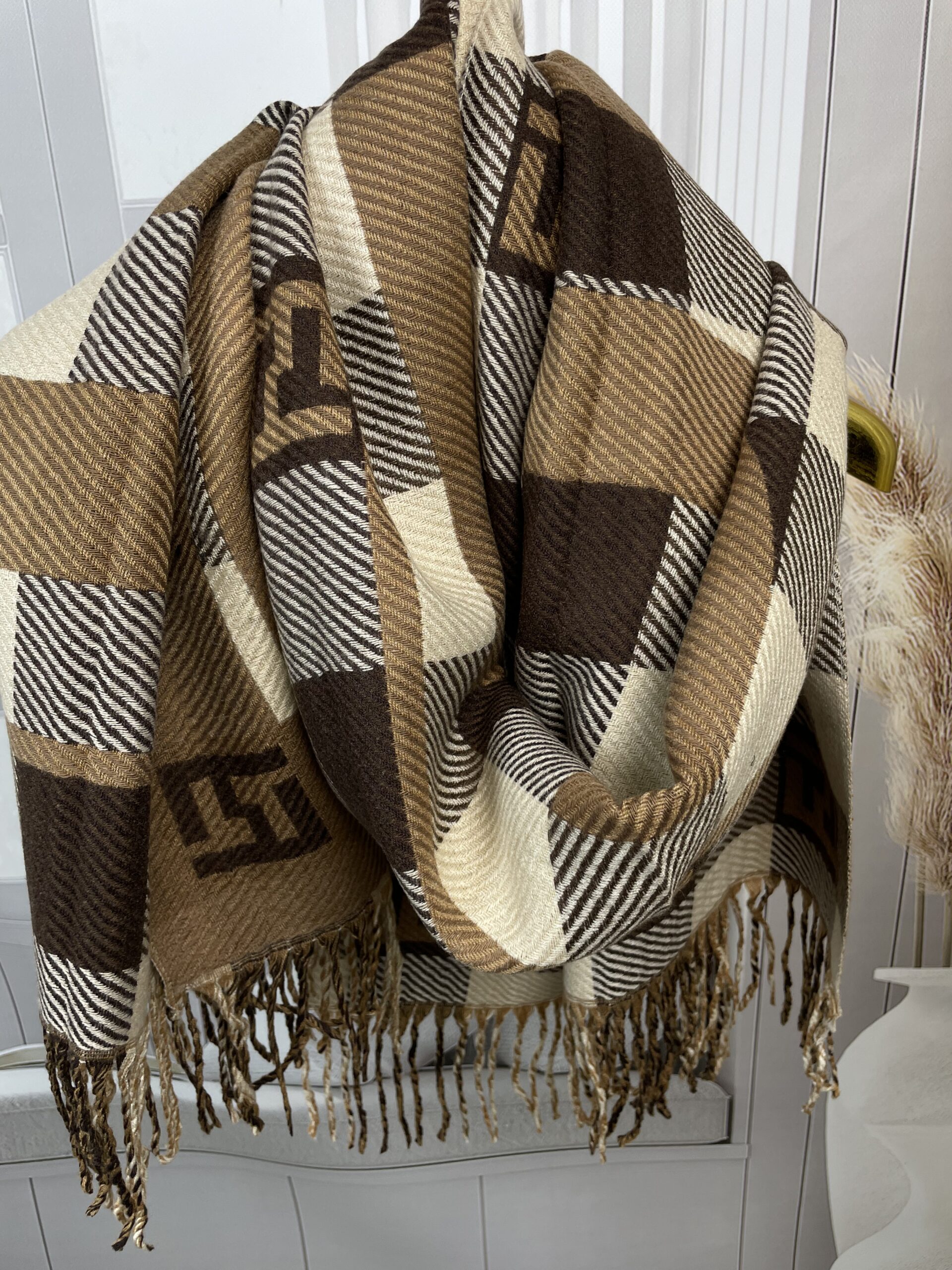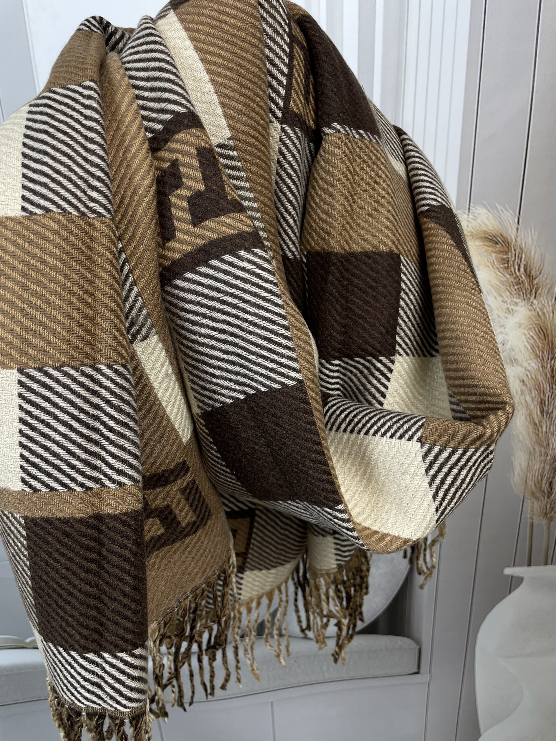 Postaw na elegancję i komfort w najlepszym wydaniu. Ten dwustronny szal z wełny i wiskozy to idealny towarzysz chłodnych dni – niezwykle miękki, przytulny i stylowy. Wzór w kratę w odcieniach beżu i brązu nadaje mu wyjątkowego charakteru – łączy klasykę z subtelną nutą romantyzmu.