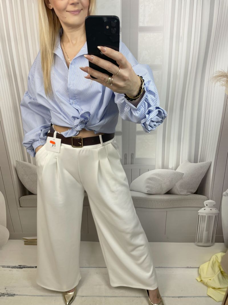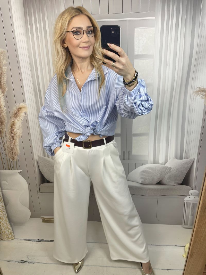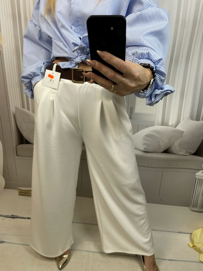 Spodnie uszyte są z materiału premium Punto Milano, który doskonale się układa, jest przyjemny w dotyku i pięknie pracuje na sylwetce. Zakładki na przodzie nadają im klasyczny, elegancki charakter oraz subtelnie modelują talię i biodra. Krój szwedów optycznie wydłuża nogi i nadaje sylwetce lekkości. Całość dopełnia elegancki pasek z ozdobną klamrą, który podkreśla talię i stanowi stylowy akcent.