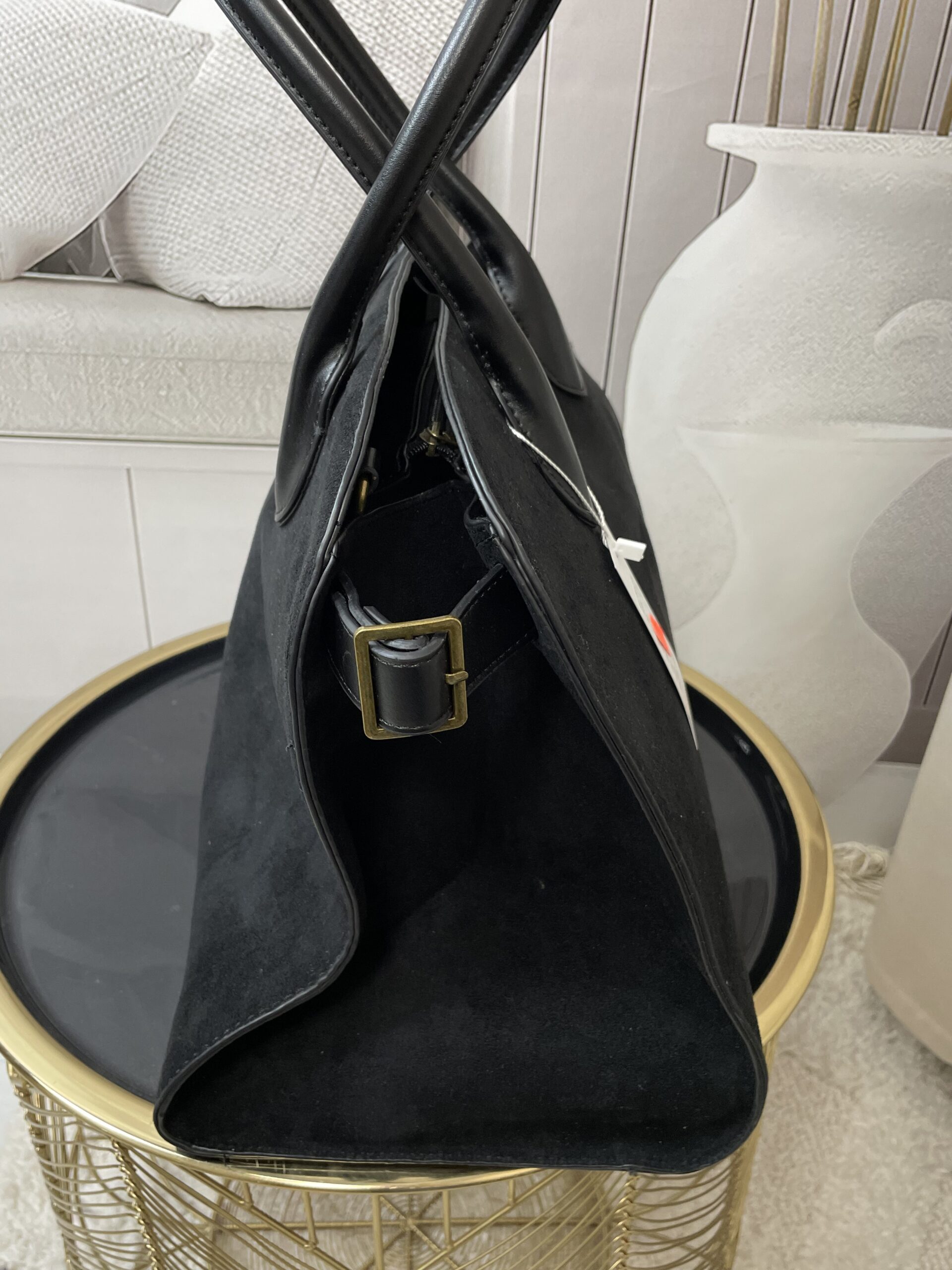 Duża torebka damska wykonana z eko-zamszu to must have tej jesieni i zimy. Torba posiada podwójne uszy, które umożliwiają noszenie na ramieniu oraz długi pasek do przewieszenia przez ramię. Środek z jedną komorą z dodatkowymi małymi kieszonkami.