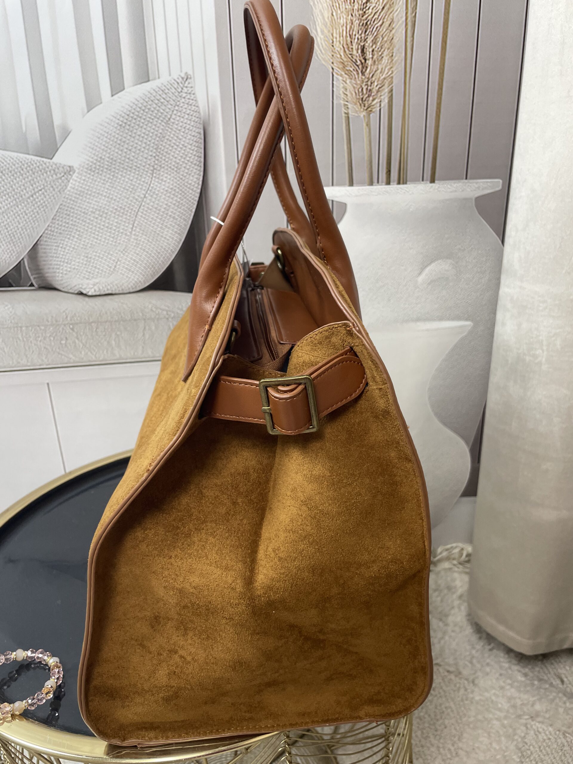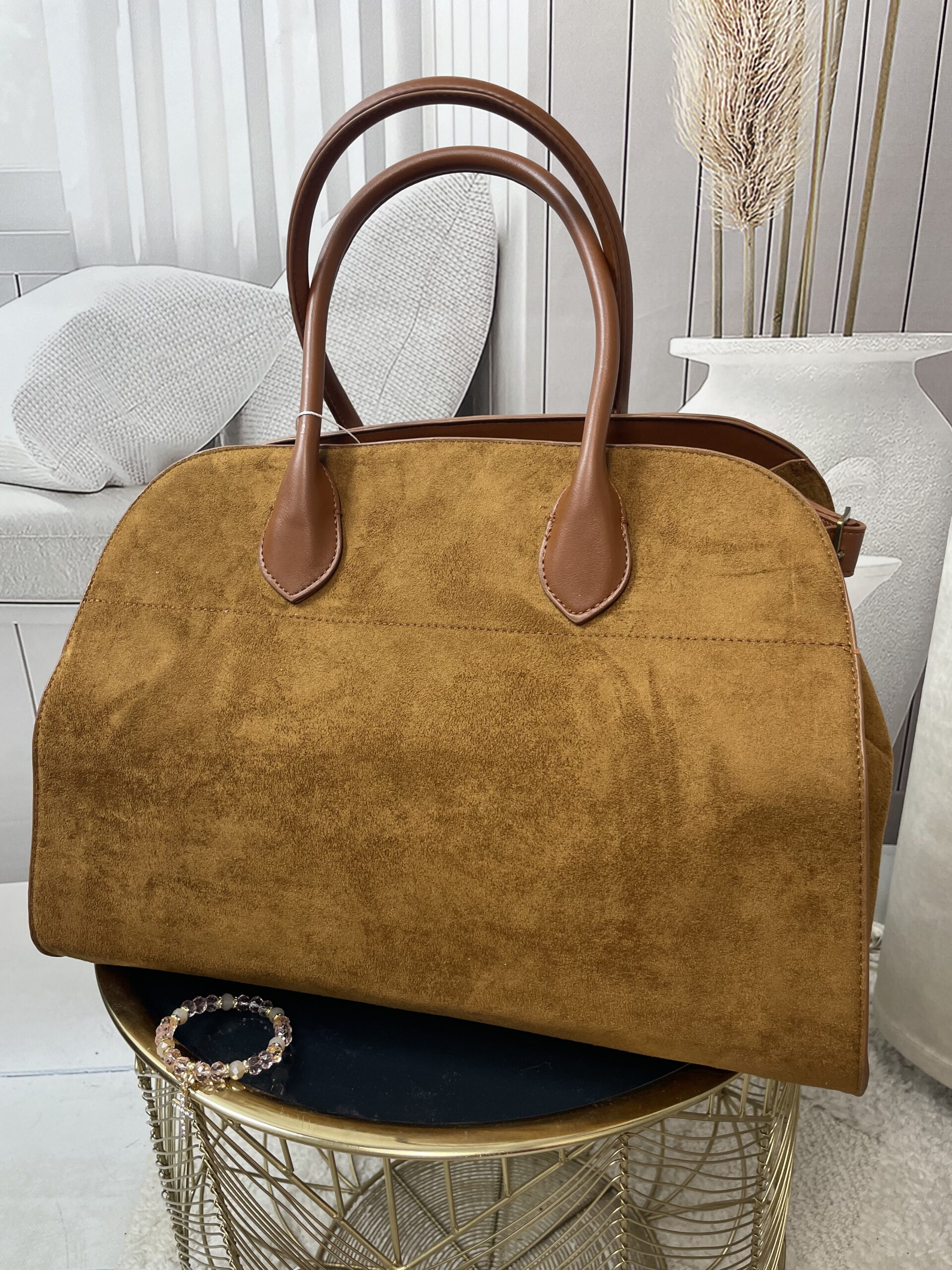Duża torebka damska wykonana z eko-zamszu to must have tej jesieni i zimy. Torba posiada podwójne uszy, które umożliwiają noszenie na ramieniu oraz długi pasek do przewieszenia przez ramię. Środek z jedną komorą z dodatkowymi małymi kieszonkami.