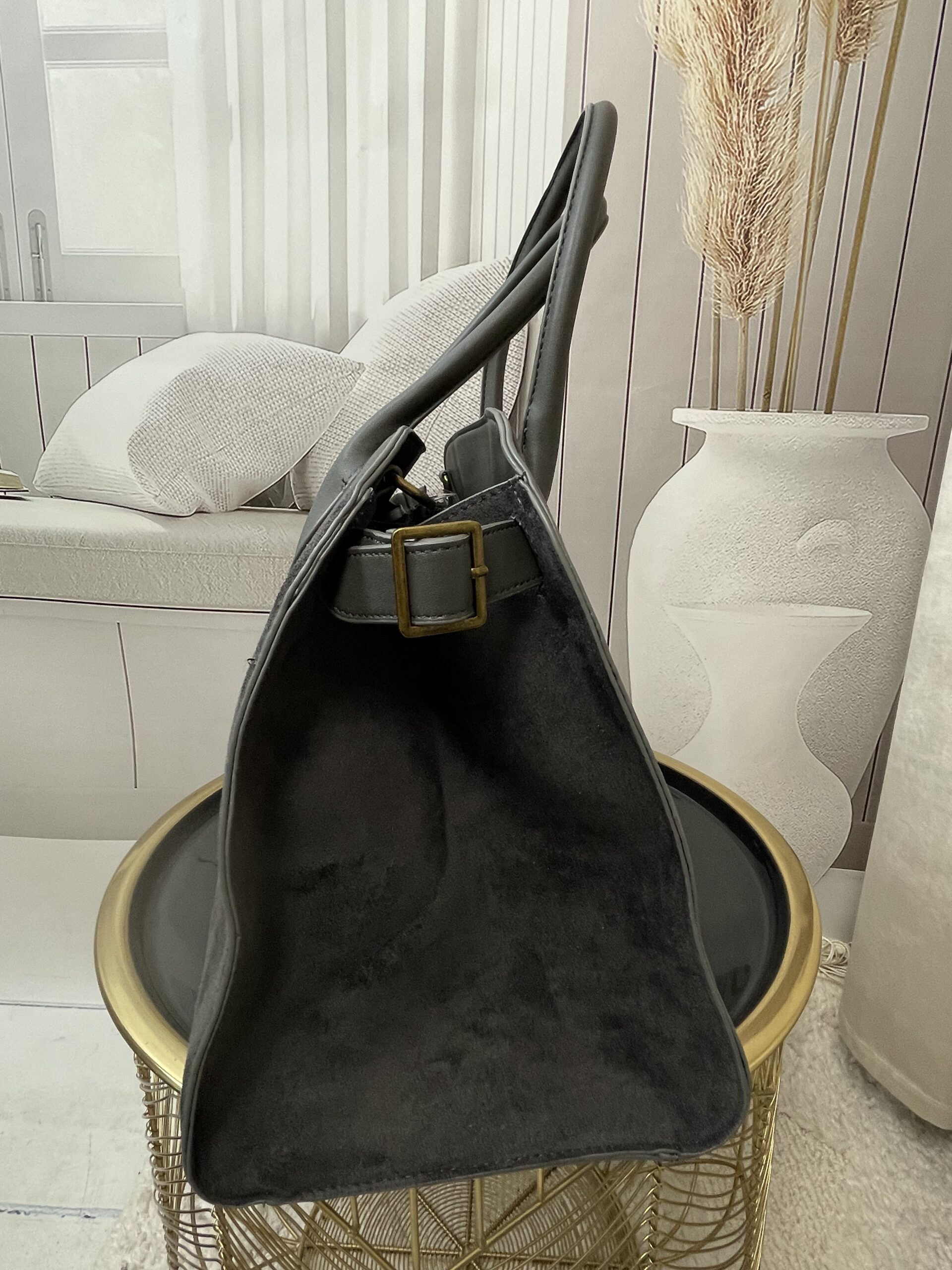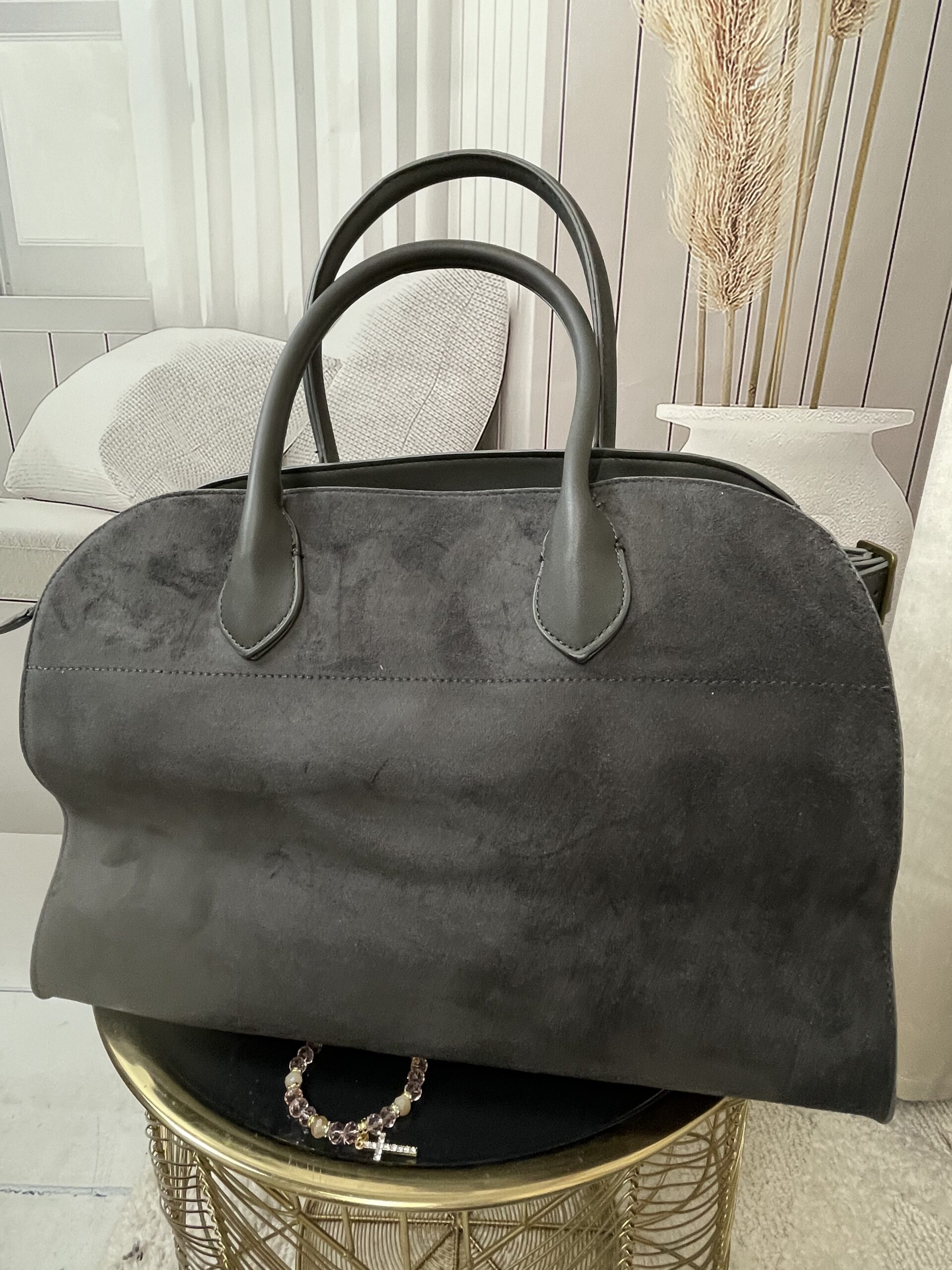 Duża torebka damska wykonana z eko-zamszu to must have tej jesieni i zimy. Torba posiada podwójne uszy, które umożliwiają noszenie na ramieniu oraz długi pasek do przewieszenia przez ramię. Środek z jedną komorą z dodatkowymi małymi kieszonkami.